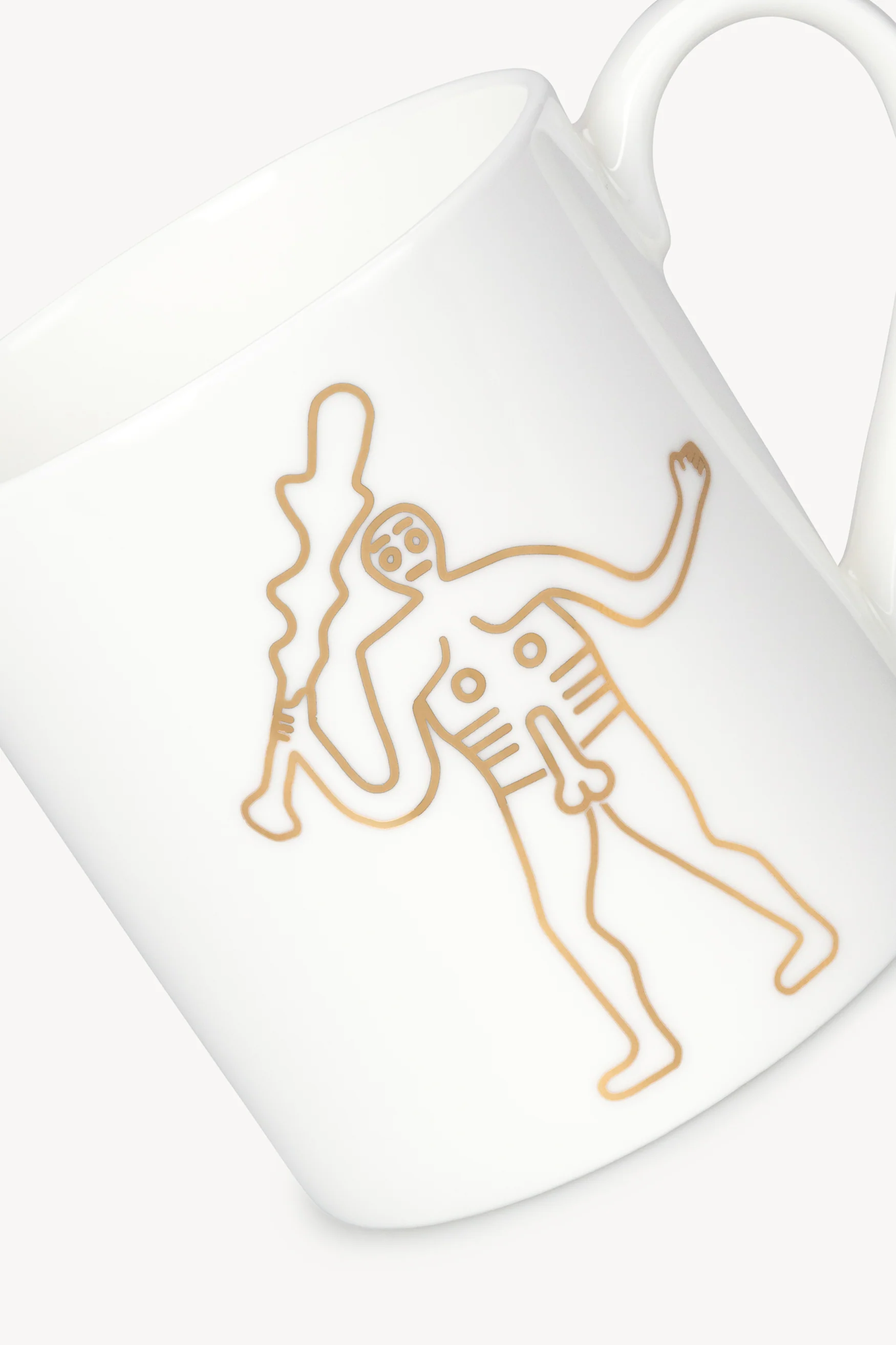 Jeremy Deller x Aries bone china mug with Cerne Abbas Giant giant graphic in gold leaf and black. Jeremy Deller x Aries tableware collection consists of plates and mugs that display different graphics inspired by Stonehenge and Neolithic sites surrounding Wiltshire.
