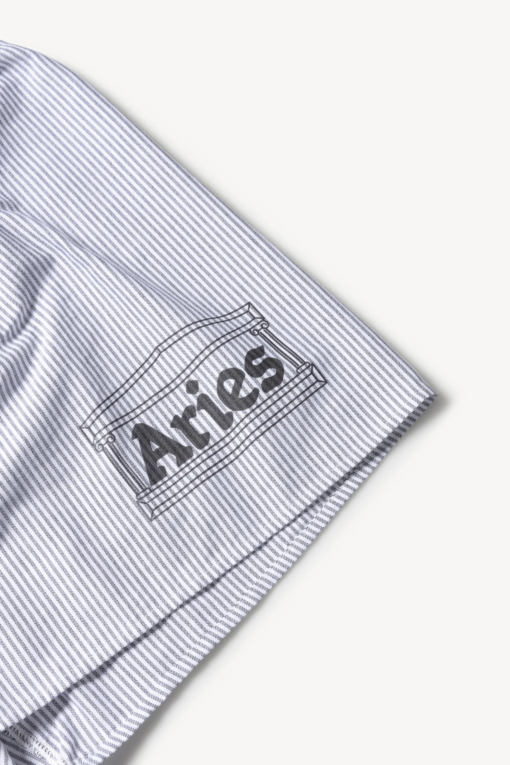 Unisex classic black and white striped boxer shorts in a washed Oxford cotton. With a branded elastic waistband and screen-printed temple logo on the leg. Sized to conventional mens sizes. 100% cotton. Made in Portugal.