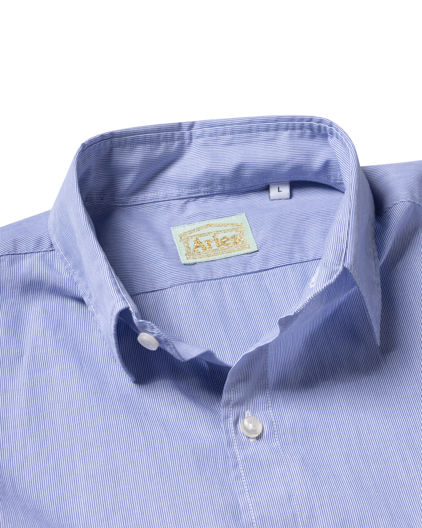Classic stripe cotton LS shirt with gold embroidered temple logo on left chest. 100% cotton